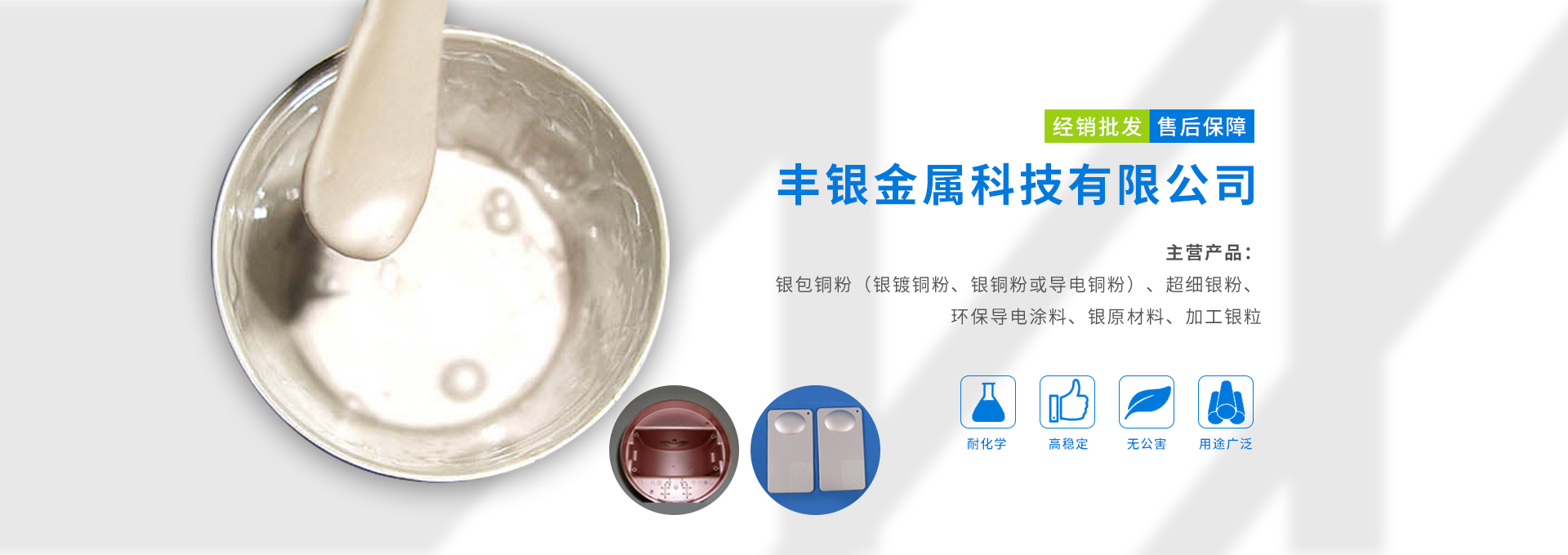 東莞市豐銀金屬科技有限公司科技力量雄厚,公司產品涉及了貴金屬原材料,高科技復合材料以及互聯網等高科技領域,有著多年開發經驗。主營產品:銀包銅粉(銀鍍銅粉、銀銅粉或導電銅粉)、超細銀粉、環保導電涂料、銀原材料、加工銀粒。公司擁有先進的金屬粉體生產技術人才和設備。產品銷往全國各地,并出口到韓國,符合國際ROHS標準。公司本著“誠信、合作、發展”的企業宗旨。竭誠為廣大用戶和商家提供優質產品、合理價格。